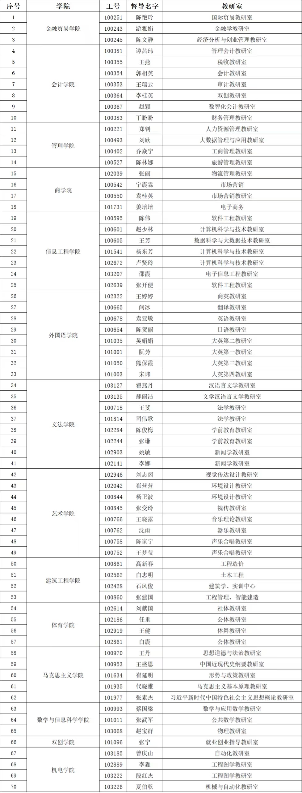 为进一步完善学校教育教学质量保障体系,强化二级学院教育教学督导队伍建设,提升督导效能,根据《郑州升达经贸管理学院本科教育教学督导工作管理办法》(升达〔2025〕54号)文件精神,经二级学院遴选推荐,学校已组建院级教育教学督导组,现将名单公布如下: