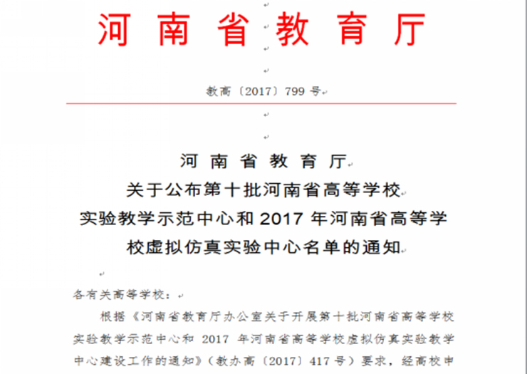 近日,河南省教育厅下发《关于公布第十批河南省高等学校实验教学示范中心和2017年河南省高等学校虚拟仿真实验中心名单的通知》(教高〔2017〕799号),我校申报的“信息工程河南省实验教学示范中心”成功入选。这是继我校经济管理实验教学中心之后第二个获得“省级实验教学示范中心”荣誉称号的实验中心。