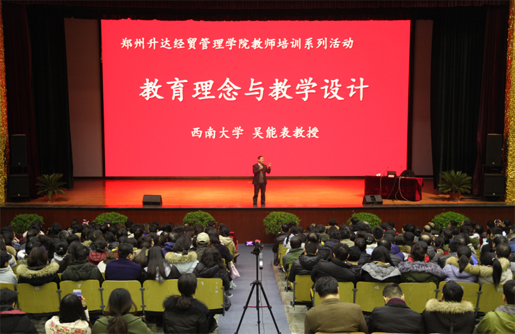 为进一步做好迎评促建工作,学习先进教学理念,提升教师专业素养和教学水平,作为学院教师培训系列活动之一,2017年2月21日,应学院教师发展中心邀请,西南大学吴能表教授在学院思源会馆作了题为《教育理念与教学设计》的教师培训专题报告会。院长郭爱先教授、常务副院长崔慕岳教授、张洁副院长、张金安副院长、段丰乐副院长以及各单位主管、专任教师、辅导员、职员等八百余人在场聆听了本次报告会。